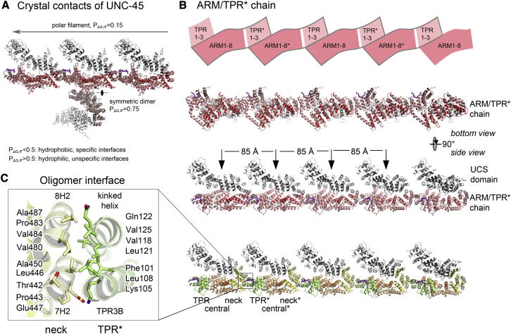 The UCS (UNC-45/CRO1/She4) chaperones play an evolutionarily conserved role in promoting myosin-dependent processes, including cytokinesis, endocytosis, RNA transport, and muscle development. To investigate the protein machinery orchestrating myosin folding and assembly, we performed a comprehensive analysis of Caenorhabditis elegans UNC-45. Our structural and biochemical data demonstrate that UNC-45 forms linear protein chains that offer multiple binding sites for cooperating chaperones and client proteins. Accordingly, Hsp70 and Hsp90, which bind to the TPR domain of UNC-45, could act in concert and with defined periodicity on captured myosin molecules. In vivo analyses reveal the elongated canyon of the UCS domain as a myosin-binding site and show that multimeric UNC-45 chains support organization of sarcomeric repeats. In fact, expression of transgenes blocking UNC-45 chain formation induces dominant-negative defects in the sarcomere structure and function of wild-type worms. Together, these findings uncover a filament assembly factor that directly couples myosin folding with myofilament formation.