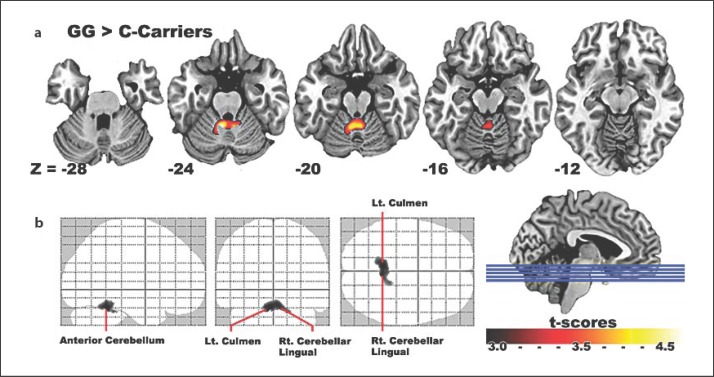 Results: Compared to C-allele carriers, G homozygotes exhibited significantly larger GM volumes in the left cerebellar culmen and right cerebellar lingual area, but no significant differences on cognitive function tests.