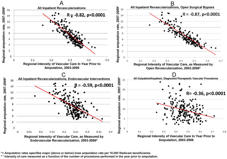 Methods: Intensity of vascular care was defined as the proportion of Medicare patients who underwent any vascular procedure in the year before amputation, calculated at the regional level (2003 to 2006), using the 306 hospital referral regions in the Dartmouth Atlas of Healthcare. The relationship between intensity of vascular care and major amputation rate, at the regional level, was examined between 2007 and 2009.