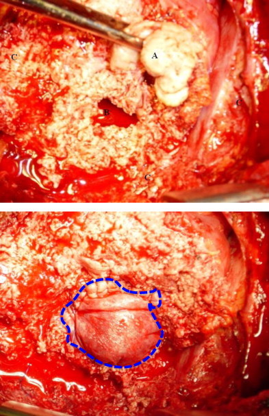 Discussion: Intraoperatively, it was confirmed that the lesion had eroded into the right atrium and partially occluded right ventricular inflow. In order to achieve appropriate palliation a wide resection of the atrial wall was necessary. The atrial reconstruction was then performed using an extracellular matrix-derived biopatch. This case was further complicated by postoperative bleeding requiring re-operation.