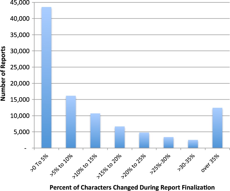 Diagnostic radiology training programs must produce highly skilled diagnostic radiologists capable of interpreting radiological examinations and communicating results to clinicians. Established training performance tools evaluate interpretive skills, but trainees' competency in reporting skills is also essential. Our semi-automated passive electronic tool entitled the Quantitative Reporting Skills Evaluation (QRSE) allows radiology training programs to evaluate the quantity of edits made to trainee preliminary reports by attending physicians as a metric to evaluate trainee reporting performance. Consecutive report pairs and metadata extracted from the radiology information system were anonymized and exported to a MySQL database. To perform the QRSE, for each report pair, open source software was first utilized to calculate the Levenshtein Percent (LP), the percent of character changes required to convert each preliminary report to its corresponding final report. The average LP (ALP), ALP for each trainee, and standard deviations were calculated. Eighty-four trainees and 56 attending radiologists interpreted 228,543 radiological examinations during the study period. The overall ALP was 6.38 %. Trainee-specific ALPs ranged from 1.1 to 15.3 %. Among trainee-specific ALPs, the standard deviation was 3.7 %. Our analysis identified five trainees with trainee-specific ALPs above 2 standard deviations from the mean and 14 trainees with trainee-specific ALPs less than 1 standard deviation below the mean. The QRSE methodology allows for the passive, quantitative, and longitudinal evaluation of the reporting skills of trainees during diagnostic radiology residency training. The QRSE identifies trainees with high and low levels of edits to their preliminary reports, as a marker for trainee overall reporting skills, and thus represents a novel performance metric for radiology training programs.