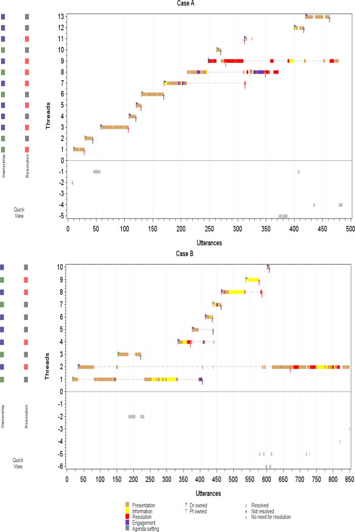 Methods: Observational study of 50 audio-recorded routine outpatient visits to HIV specialty clinics, using innovative analytic methods. The comprehensive analysis of the structure of encounters system (CASES) uses transcripts coded for speech acts, then imposes larger-scale structural elements: threads--the problems or issues addressed; and processes within threads--basic tasks of clinical care labeled presentation, information, resolution (decision making) and Engagement (interpersonal exchange). Threads are also coded for the nature of resolution.