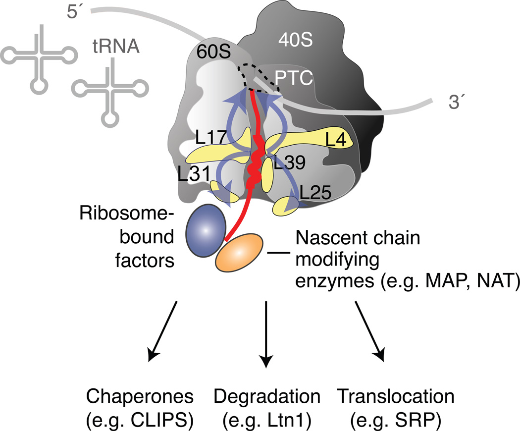 Cells face a constant challenge as they produce new proteins. The newly synthesized polypeptides must be folded properly to avoid aggregation. If proteins do misfold, they must be cleared to maintain a functional and healthy proteome. Recent work is revealing the complex mechanisms that work cotranslationally to ensure protein quality control during biogenesis at the ribosome. Indeed, the ribosome is emerging as a central hub in coordinating these processes, particularly in sensing the nature of the nascent protein chain, recruiting protein folding and translocation components, and integrating mRNA and nascent chain quality control. The tiered and complementary nature of these decision-making processes confers robustness and fidelity to protein homeostasis during protein synthesis.