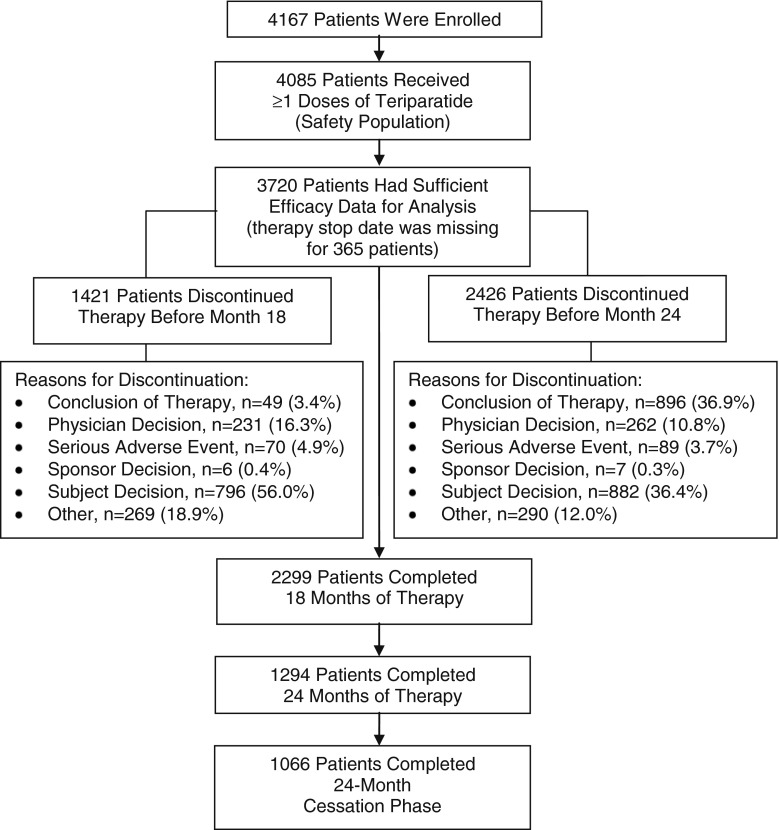 Methods: DANCE is a multicenter, prospective, observational trial that examined the long-term effectiveness of TPTD in men and women with osteoporosis whom study physicians judged to be suitable for TPTD therapy. Patients received 20 μg TPTD per day by subcutaneous injection for up to 24 months and were followed for 24 months after treatment cessation. The incidence of patients experiencing a new NVFX, defined as a fracture associated with low trauma, was evaluated during four 6-month periods in both the treatment and cessation phases with >0 to ≤6 months serving as the reference. We also observed the spectrum and occurrence of serious adverse events.