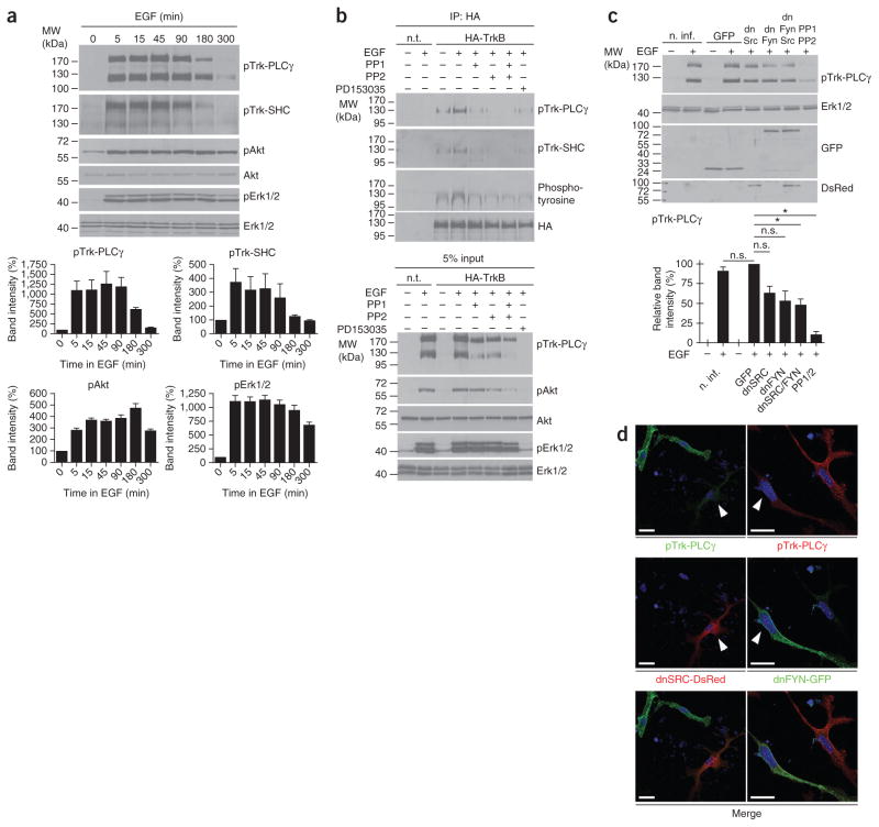 The development of neuronal networks in the neocortex depends on control mechanisms for mitosis and migration that allow newborn neurons to find their accurate position. Multiple mitogens, neurotrophic factors, guidance molecules and their corresponding receptors are involved in this process, but the mechanisms by which these signals are integrated are only poorly understood. We found that TrkB and TrkC, the receptors for brain-derived neurotrophic factor (BDNF) and neurotrophin-3 (NT-3), are activated by epidermal growth factor receptor (EGFR) signaling rather than by BDNF or NT-3 in embryonic mouse cortical precursor cells. This transactivation event regulated migration of early neuronal cells to their final position in the developing cortex. Transactivation by EGF led to membrane translocation of TrkB, promoting its signaling responsiveness. Our results provide genetic evidence that TrkB and TrkC activation in early cortical neurons do not depend on BDNF and NT-3, but instead on transactivation by EGFR signaling.