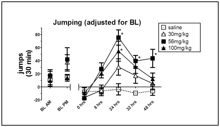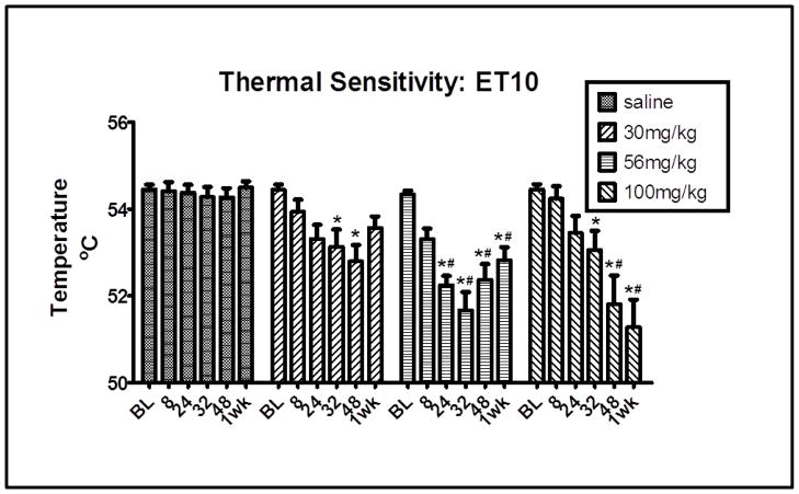 Results: During the withdrawal period, thermal sensitivity increased significantly in all morphine-treated mice as compared to saline-treated mice. Thermal sensitivity was greater in mice treated with 56mg/kg morphine compared to 30mg/kg and peaked earlier than in mice treated with 100mg/kg (32h v 1wk). The increase in thermal sensitivity following 56mg/kg morphine was attenuated by a dose of buprenorphine that did not produce antinociception alone (i.e., 0.01mg/kg). In general, the results of the jumping experiment paralleled those obtained in Experiment I.