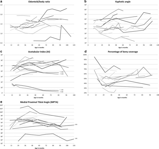 Hurler syndrome (MPS-IH) is a rare autosomal recessive lysosomal storage disease. Besides a variety of other features, Hurler syndrome is characterized by a range of skeletal abnormalities known as dysostosis multiplex. Despite the successful effect of haematopoietic stem cell transplantation on the other features, dysostosis remains a disabling symptom of the disease. This study analyzed the status and development of the orthopaedic manifestations of 14 Dutch Hurler patients after stem cell transplantation.Data were obtained retrospectively by reviewing patients' charts, radiographs and MRIs. Existing methods to measure the deficiencies were modified to optimally address the dysostosis. These measurements were done by two of the authors independently. The odontoïd/body ratio, kyphotic angle, scoliotic angle and parameters for hip dysplasia and genu valgum were measured and plotted against age. The degree of progression was determined. The intraclass correlation coefficient (ICC) was calculated to determine the reliability of the measurements.All patients showed hypoplasia of the odontoïd, which significantly improved during growth. Kyphosis in the thoracolumbar area was present in 13 patients and proved to be progressive. Scoliosis was observed in eight patients. Hip dysplasia was present in all patients and showed no tendency of improvement. In all but one patient, knee valgus remained more than two standard deviations above normal.Dysostosis remains a major problem after haematopoietic stem cell transplantation in Hurler patients. Moreover, except for dens hypoplasia, it appears to be progressive and therefore surgical interventions may be necessary in the majority of these patients.