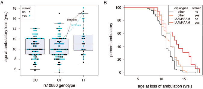 Results: Individuals homozygous for the IAAM LTBP4 haplotype remained ambulatory significantly longer than those heterozygous or homozygous for the VTTT haplotype. Glucocorticoid-treated patients who were IAAM homozygotes lost ambulation at 12.5 ± 3.3 years compared to 10.7 ± 2.1 years for treated VTTT heterozygotes or homozygotes. IAAM fibroblasts exposed to transforming growth factor (TGF) β displayed reduced phospho-SMAD signaling compared to VTTT fibroblasts, consistent with LTBP4' role as a regulator of TGFβ.