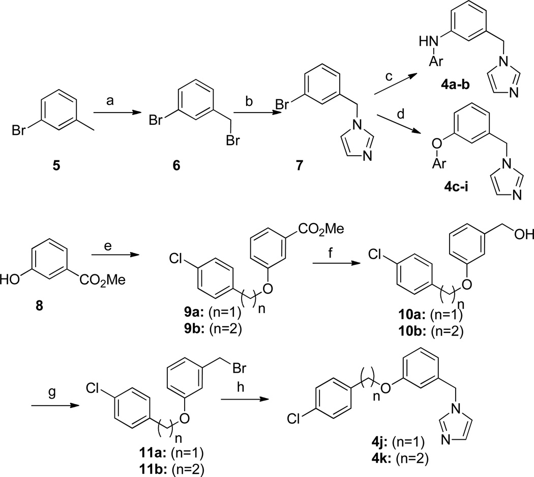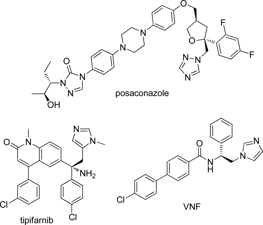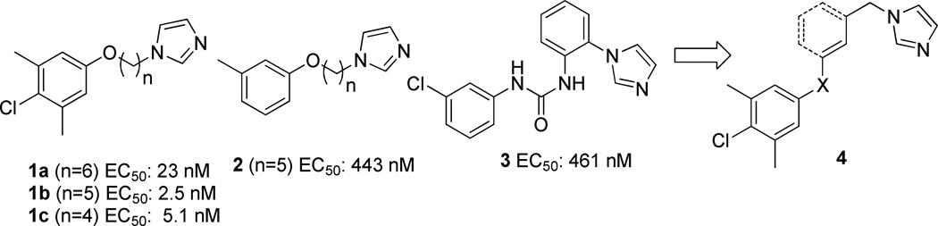 Chagas disease is caused by the intracellular protozoan parasite Trypanosomal cruzi , and current drugs are lacking in terms of desired safety and efficacy profiles. Following on a recently reported high-throughput screening campaign, we have explored initial structure-activity relationships around a class of imidazole-based compounds. This profiling has uncovered compounds 4c (NEU321) and 4j (NEU704), which are potent against in vitro cultures of T. cruzi and are greater than 160-fold selective over host cells. We report in vitro drug metabolism and properties profiling of 4c and show that this chemotype inhibits the T. cruzi CYP51 enzyme, an observation confirmed by X-ray crystallographic analysis. We compare the binding orientation of 4c to that of other, previously reported inhibitors. We show that 4c displays a significantly better ligand efficiency and a shorter synthetic route over previously disclosed CYP51 inhibitors, and should therefore be considered a promising lead compound for further optimization.