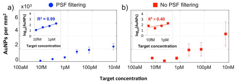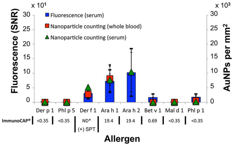 Although biomarkers exist for a range of disease diagnostics, a single low-cost platform exhibiting the required sensitivity, a large dynamic-range and multiplexing capability, and zero sample preparation remains in high demand for a variety of clinical applications. The Interferometric Reflectance Imaging Sensor (IRIS) was utilized to digitally detect and size single gold nanoparticles to identify protein biomarkers in unprocessed serum and blood samples. IRIS is a simple, inexpensive, multiplexed, high-throughput, and label-free optical biosensor that was originally used to quantify biomass captured on a surface with moderate sensitivity. Here we demonstrate detection of β-lactoglobulin, a cow's milk whey protein spiked in serum (>10 orders of magnitude) and whole blood (>5 orders of magnitude), at attomolar sensitivity. The clinical utility of IRIS was demonstrated by detecting allergen-specific IgE from microliters of characterized human serum and unprocessed whole blood samples by using secondary antibodies against human IgE labeled with 40 nm gold nanoparticles. To the best of our knowledge, this level of sensitivity over a large dynamic range has not been previously demonstrated. IRIS offers four main advantages compared to existing technologies: it (i) detects proteins from attomolar to nanomolar concentrations in unprocessed biological samples, (ii) unambiguously discriminates nanoparticles tags on a robust and physically large sensor area, (iii) detects protein targets with conjugated very small nanoparticle tags (~40 nm diameter), which minimally affect assay kinetics compared to conventional microparticle tagging methods, and (iv) utilizes components that make the instrument inexpensive, robust, and portable. These features make IRIS an ideal candidate for clinical and diagnostic applications.