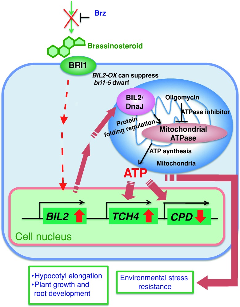 Plant steroid hormones, brassinosteroids, are essential for growth, development and responses to environmental stresses in plants. Although BR signaling proteins are localized in many organelles, i.e., the plasma membrane, nuclei, endoplasmic reticulum and vacuole, the details regarding the BR signaling pathway from perception at the cellular membrane receptor BRASSINOSTEROID INSENSITIVE 1 (BRI1) to nuclear events include several steps. Brz (Brz220) is a specific inhibitor of BR biosynthesis. In this study, we used Brz-mediated chemical genetics to identify Brz-insensitive-long hypocotyls 2-1D (bil2-1D). The BIL2 gene encodes a mitochondrial-localized DnaJ/Heat shock protein 40 (DnaJ/Hsp40) family, which is involved in protein folding. BIL2-overexpression plants (BIL2-OX) showed cell elongation under Brz treatment, increasing the growth of plant inflorescence and roots, the regulation of BR-responsive gene expression and suppression against the dwarfed BRI1-deficient mutant. BIL2-OX also showed resistance against the mitochondrial ATPase inhibitor oligomycin and higher levels of exogenous ATP compared with wild-type plants. BIL2 participates in resistance against salinity stress and strong light stress. Our results indicate that BIL2 induces cell elongation during BR signaling through the promotion of ATP synthesis in mitochondria.