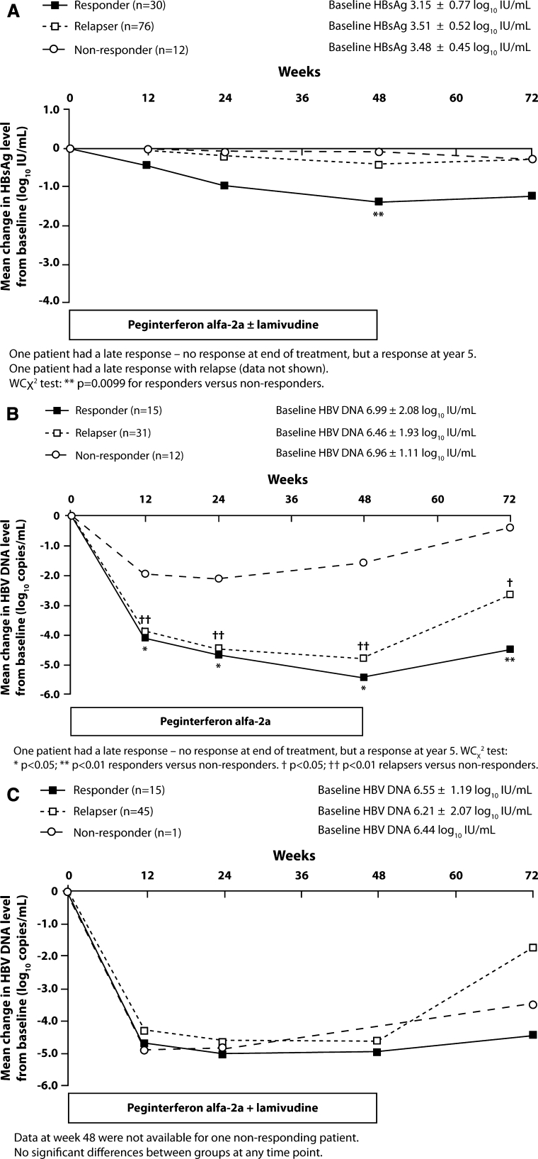Results: HBV DNA ≤2,000 IU/mL and HBsAg clearance at 5 years post-treatment were achieved by 23 and 12% of patients, respectively. High rates of HBsAg clearance at 5 years post-treatment were achieved by patients with HBV DNA ≤2,000 IU/mL at 1 year post-treatment (28%). Rates of HBV DNA ≤2,000 IU/mL at 1 year post-treatment were 47.2 and 43.4% in patients with ≥10% decline from baseline at weeks 12 and 24, respectively, compared with 16.4% (p = 0.0003) and 13.2% (p < 0.0004) in patients with a <10% decline. Rates of HBsAg clearance at 5 years post-treatment were 22.6 and 22.4% in patients with ≥10% decline at weeks 12 and 24, respectively, compared with 7.5% (p = 0.0161) and 3.8% (p < 0.0001) in patients with <10% decline.