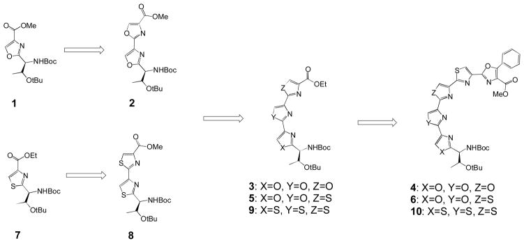 We report the synthesis, cytotoxicity, and phenotypic analysis of oxazole and thiazole containing fragments. Evaluating the optimal size and heterocycle for growth inhibition and apoptosis showed that activity required at least two thiazoles sequentially connected. This is the first detailed comparison of biological activity between multi-heterocyclic containing fragments.