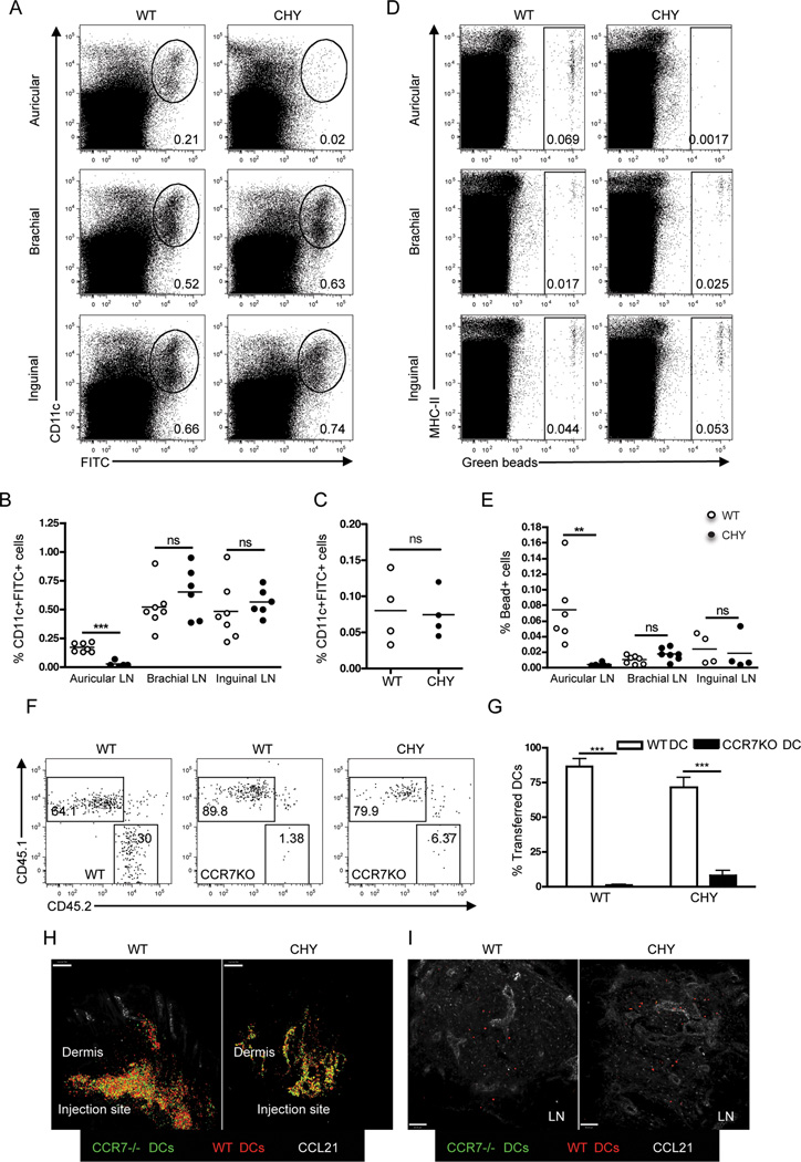 To address the requirement for lymphatic capillaries in dendritic cell (DC) mobilization from skin to lymph nodes (LNs), we used mice bearing one inactivated allele of vascular endothelial growth factor receptor 3 (VEGFR3) where skin lymphatic capillaries are reported absent. Unexpectedly, DC mobilization from the back skin to draining LNs was similar in magnitude, and kinetics to control mice and humoral immunity appeared intact. By contrast, DC migration from body extremities, including ear and forepaws, was ablated. An evaluation in different regions of skin revealed rare patches of lymphatic capillaries only in body trunk areas where migration was intact. That is, whereas the ear skin was totally devoid of lymphatic capillaries, residual capillaries in the back skin were present though retained only at ∼10% normal density. This reduction in density markedly reduced the clearance of soluble tracers, indicating that normal cell migration was spared under conditions when lymphatic transport function was poor. Residual lymphatic capillaries expressed slightly higher levels of CCL21 and migration of skin DCs to LNs remained dependent on CCR7 in Chy mice. DC migration from the ear could be rescued by the introduction of a limited number of lymphatic capillaries through skin transplantation. Thus, the development of lymphatic capillaries in the skin of body extremities was more severely impacted by a mutant copy of VEGFR3 than trunk skin, but lymphatic transport function was markedly reduced throughout the skin, demonstrating that even under conditions when a marked loss in lymphatic capillary density reduces lymph transport, DC migration from skin to LNs remains normal.