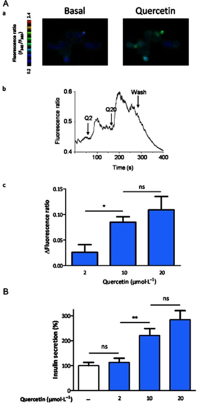 Background and purpose: Quercetin is a natural polyphenolic flavonoid that displays anti-diabetic properties in vivo. Its mechanism of action on insulin-secreting beta cells is poorly documented. In this work, we have analysed the effects of quercetin both on insulin secretion and on the intracellular calcium concentration ([Ca(2+)]i) in beta cells, in the absence of any co-stimulating factor.