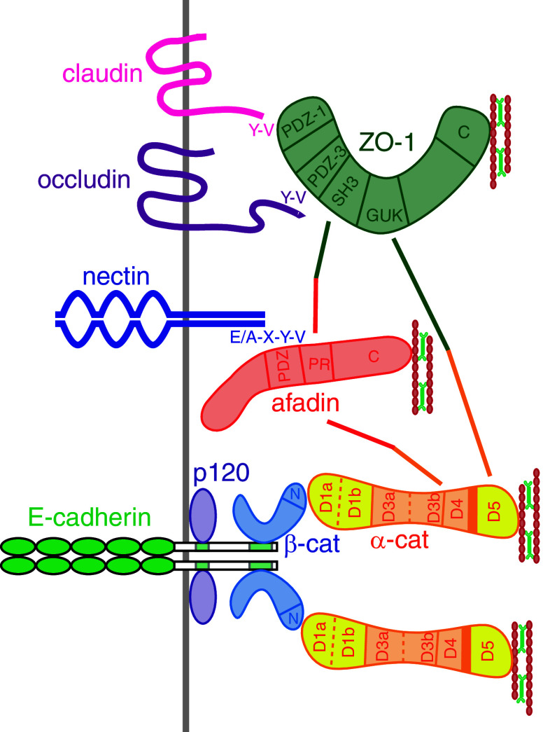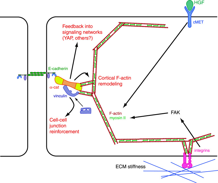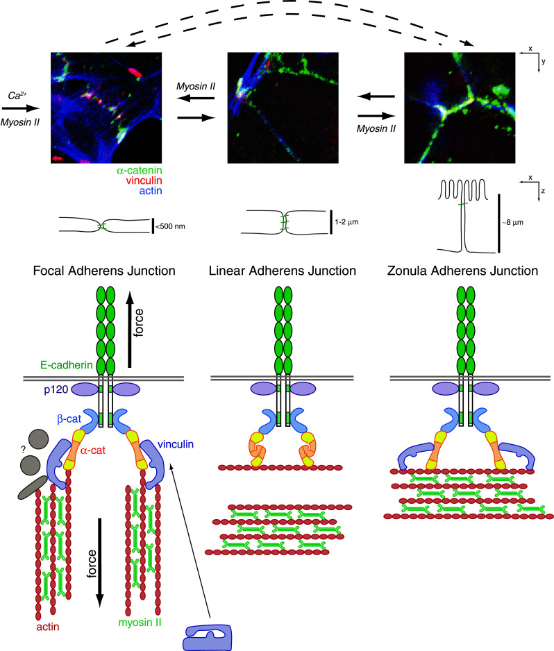 Mechanical forces are increasingly recognized as central factors in the regulation of tissue morphogenesis and homeostasis. Central to the transduction of mechanical information into biochemical signaling is the contractile actomyosin cytoskeleton. Fluctuations in actomyosin contraction are sensed by tension sensitive systems at the interface between actomyosin and cell adhesion complexes. We review the current knowledge about the mechanical coupling of cell-cell junctions to the cytoskeleton and highlight the central role of α-catenin in this linkage. We assemble current knowledge about α-catenin's regulation by tension and about its interactions with a diversity of proteins. We present a model in which α-catenin is a force-regulated platform for a machinery of proteins that orchestrates local cortical remodeling in response to force. Finally, we highlight recently described fundamental processes in tissue morphogenesis and argue where and how this α-catenin-dependent cadherin mechanotransduction may be involved.