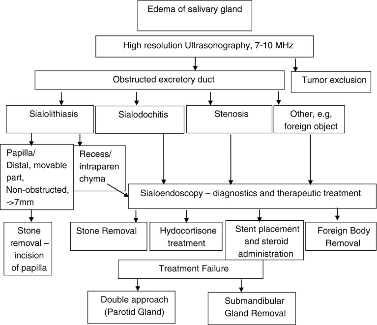 Our research was conducted to determine the algorithm changes during the treatment of submandibular sialolithiasis. Two time periods were compared between 2004-2008 and 2009-2012. The turning point was December 2008, when sialendoscopy procedure was introduced. In the first period, 48 patients were treated: 31 outpatient duct incisions with stone evacuation and 17 surgical excision of submandibular gland. In the second period, 207 sialendoscopy procedures were performed on 197 patients. Out of this particular group, 158 patients were diagnosed with pathological obstruction of salivary glands and 64 of them were confirmed to have sialolithiasis of submandibular gland. Deposits of calcifications in 40 individuals (62.5 %) affected by sialolithiasis were removed endoscopically; however, in 21 patients, due to the increased circumference of the stone, the intimate association of deposits within the wall of the duct along with its presence inside the deep portions of the gland, double approach (incision of the floor of the mouth in hilar area and sialendoscopy) was performed. Three individuals had their salivary glands totally removed due to the presence of calcified deposits within the glandular parenchyma. Our results allow us to affirm that sialendoscopy is the current treatment of choice for submandibular glands affected by sialoliths. Indication for a complete removal of the gland is becoming uncommon as a first line treatment although still indispensable in chosen cases.