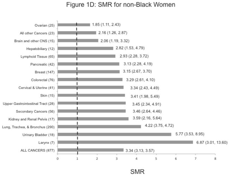 Results: Overall, there was excess mortality from cancer associated with having mental illness in all the race/sex strata: SMR, 2.16 (95% CI, 1.85-2.50) for black men; 2.63 (2.31-2.98) for black women; 3.89 (3.61-4.19) for nonblack men; and 3.34 (3.13-3.57) for nonblack women. In all the race/sex strata except for black women, the highest SMR was observed for laryngeal cancer, 3.94 (1.45-8.75) in black men and 6.51 (3.86-10.35) and 6.87 (3.01-13.60) in nonblack men and women, respectively. The next highest SMRs were noted for hepatobiliary cancer and cancer of the urinary tract in all race/sex strata, except for black men.
