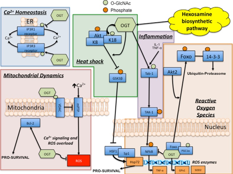 O-linked N-acetyl-β-D-glucosamine (O-GlcNAc) is a ubiquitous and dynamic post-translational modification known to modify over 3,000 nuclear, cytoplasmic, and mitochondrial eukaryotic proteins. Addition of O-GlcNAc to proteins is catalyzed by the O-GlcNAc transferase and is removed by a neutral-N-acetyl-β-glucosaminidase (O-GlcNAcase). O-GlcNAc is thought to regulate proteins in a manner analogous to protein phosphorylation, and the cycling of this carbohydrate modification regulates many cellular functions such as the cellular stress response. Diverse forms of cellular stress and tissue injury result in enhanced O-GlcNAc modification, or O-GlcNAcylation, of numerous intracellular proteins. Stress-induced O-GlcNAcylation appears to promote cell/tissue survival by regulating a multitude of biological processes including: the phosphoinositide 3-kinase/Akt pathway, heat shock protein expression, calcium homeostasis, levels of reactive oxygen species, ER stress, protein stability, mitochondrial dynamics, and inflammation. Here, we will discuss the regulation of these processes by O-GlcNAc and the impact of such regulation on survival in models of ischemia reperfusion injury and trauma hemorrhage. We will also discuss the misregulation of O-GlcNAc in diseases commonly associated with the stress response, namely Alzheimer's and Parkinson's diseases. Finally, we will highlight recent advancements in the tools and technologies used to study the O-GlcNAc modification.