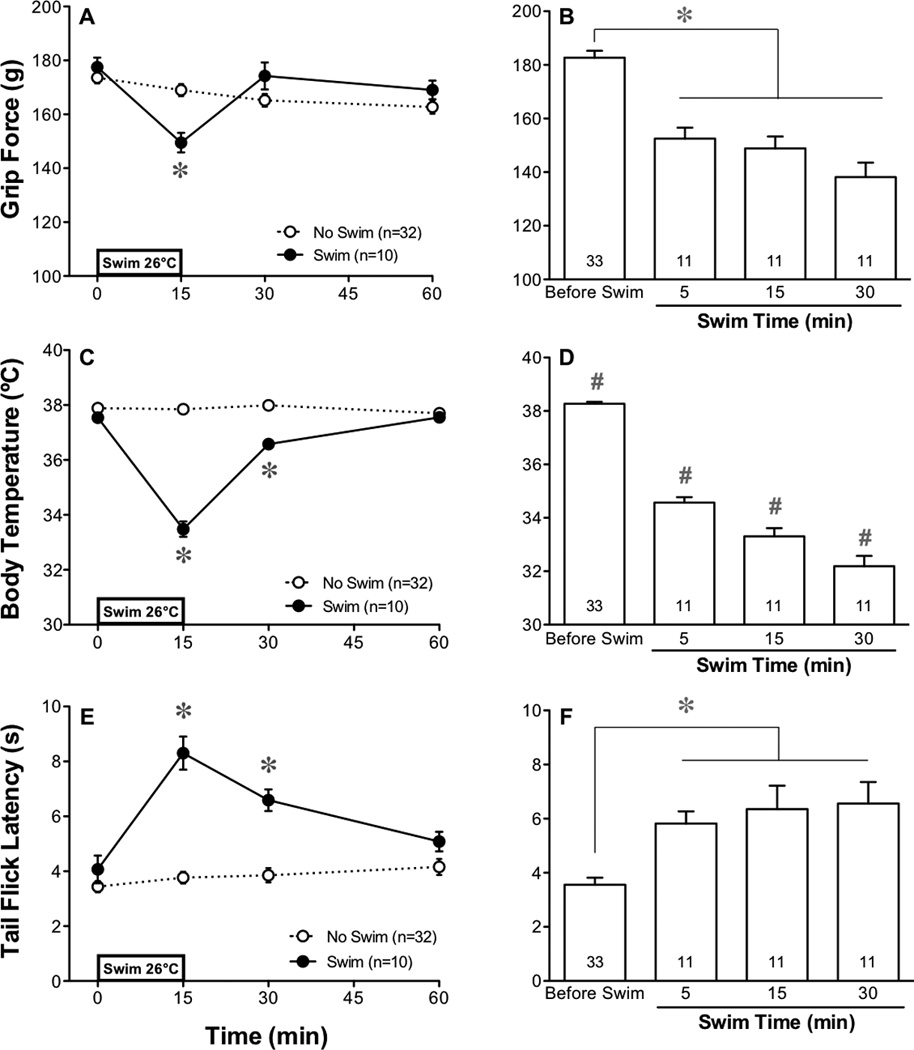 The exacerbation of musculoskeletal pain by stress in humans is modeled by the musculoskeletal hyperalgesia in rodents following a forced swim. We hypothesized that stress-sensitive corticotropin releasing factor (CRF) receptors and transient receptor vanilloid 1 (TRPV1) receptors are responsible for the swim stress-induced musculoskeletal hyperalgesia. We confirmed that a cold swim (26 °C) caused a transient, morphine-sensitive decrease in grip force responses reflecting musculoskeletal hyperalgesia in mice. Pretreatment with the CRF2 receptor antagonist astressin 2B, but not the CRF1 receptor antagonist NBI-35965, attenuated this hyperalgesia. Desensitizing the TRPV1 receptor centrally or peripherally using desensitizing doses of resiniferatoxin (RTX) failed to prevent the musculoskeletal hyperalgesia produced by cold swim. SB-366791, a TRPV1 antagonist, also failed to influence swim-induced hyperalgesia. Together these data indicate that swim stress-induced musculoskeletal hyperalgesia is mediated, in part, by CRF2 receptors but is independent of the TRPV1 receptor.