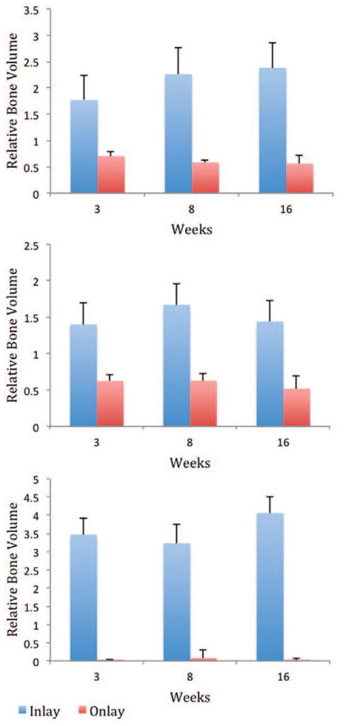 Results: All bone graft types in the inlay position increased their volume over time, with the greatest increase in endochondral cancellous bone. All bone graft types in the onlay position decreased their volume over time, with the greatest decrease in endochondral cancellous bone. Inlay bone grafts demonstrated increased volume compared with onlay bone grafts of identical embryologic origin and microarchitecture at all time points (p < 0.05).