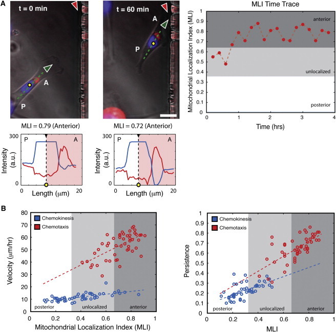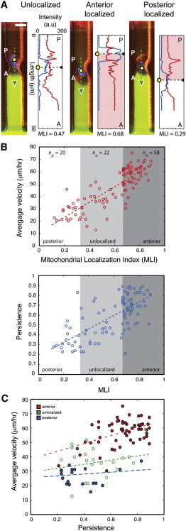 During cancer cell invasion, faster moving cancer cells play a dominant role by invading further and metastasizing earlier. Despite the importance of these outlier cells, the source of heterogeneity in their migratory behavior remains poorly understood. Here, we show that anterior localization of mitochondria, in between the nucleus and the leading edge of migrating epithelial cancer cells, correlates with faster migration velocities and increased directional persistence. The asymmetry of mitochondrial localization along the axis of migration is absent during spontaneous cell migration on two-dimensional surfaces and only occurs in the presence of chemical attractant cues or in conditions of mechanical confinement. Moreover, perturbing the asymmetric distribution of mitochondria within migrating cells by interfering with mitochondrial fusion (opa-1) or fission (drp-1) proteins, significantly reduces the number of cells with anterior localization of mitochondria and significantly decreases the velocity and directional persistence of the fastest moving cells. We also observed similar changes after perturbing the linkage between mitochondria and microtubules by the knockdown of mitochondrial rhoGTPase-1 (miro-1). Taken together, the changes in migration velocity and directional persistence in cells with anterior-localized mitochondria could account for an order of magnitude differences in invasive abilities between cells from otherwise homogenous cell populations.