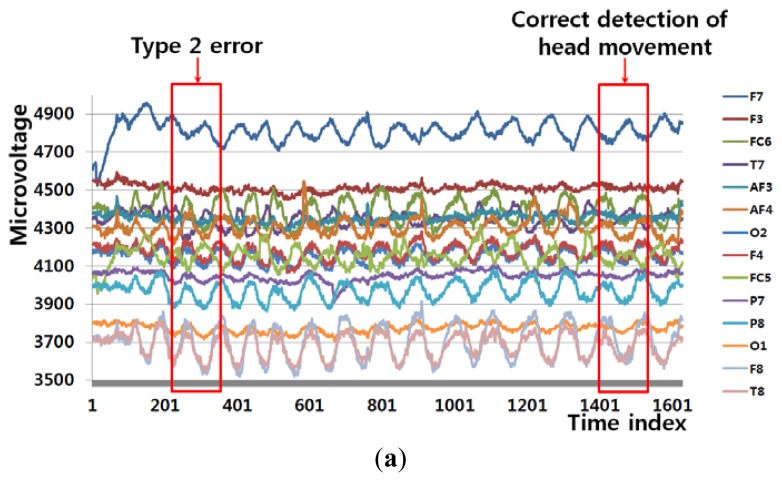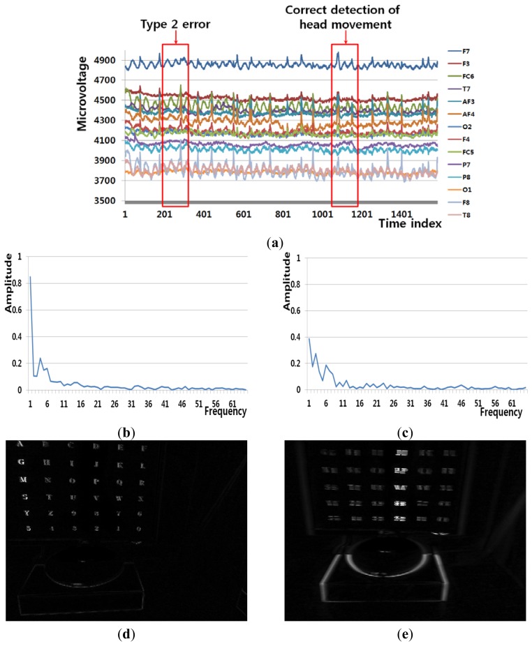Electroencephalogram (EEG)-based brain-computer interfaces (BCIs) have been used in various applications, including human-computer interfaces, diagnosis of brain diseases, and measurement of cognitive status. However, EEG signals can be contaminated with noise caused by user's head movements. Therefore, we propose a new method that combines an EEG acquisition device and a frontal viewing camera to isolate and exclude the sections of EEG data containing these noises. This method is novel in the following three ways. First, we compare the accuracies of detecting head movements based on the features of EEG signals in the frequency and time domains and on the motion features of images captured by the frontal viewing camera. Second, the features of EEG signals in the frequency domain and the motion features captured by the frontal viewing camera are selected as optimal ones. The dimension reduction of the features and feature selection are performed using linear discriminant analysis. Third, the combined features are used as inputs to support vector machine (SVM), which improves the accuracy in detecting head movements. The experimental results show that the proposed method can detect head movements with an average error rate of approximately 3.22%, which is smaller than that of other methods.