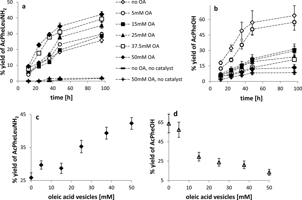 The advent of Darwinian evolution required the emergence of molecular mechanisms for the heritable variation of fitness. One model for such a system involves competing protocell populations, each consisting of a replicating genetic polymer within a replicating vesicle. In this model, each genetic polymer imparts a selective advantage to its protocell by, for example, coding for a catalyst that generates a useful metabolite. Here, we report a partial model of such nascent evolutionary traits in a system that consists of fatty-acid vesicles containing a dipeptide catalyst, which catalyses the formation of a second dipeptide. The newly formed dipeptide binds to vesicle membranes, which imparts enhanced affinity for fatty acids and thus promotes vesicle growth. The catalysed dipeptide synthesis proceeds with higher efficiency in vesicles than in free solution, which further enhances fitness. Our observations suggest that, in a replicating protocell with an RNA genome, ribozyme-catalysed peptide synthesis might have been sufficient to initiate Darwinian evolution.