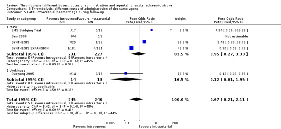 Main results: We included 20 trials involving 2527 patients. Concealment of allocation was poorly described. Different doses (of tissue plasminogen activator, urokinase, desmoteplase or tenecteplase) were compared in 13 trials (N = 1433 patients). Different agents (tissue plasminogen activator versus urokinase, tissue-cultured urokinase versus conventional urokinase, tenecteplase versus tissue plasminogen activator) were compared in five trials (N = 875 patients). Five trials (N = 485) compared different routes of administration. As some trials compared different agents and different doses, some patients contributed to two analyses. There was an approximately three-fold increase in fatal intracranial haemorrhages in patients allocated to higher than to lower doses of the same thrombolytic drug (odds ratio (OR) 2.71, 95% confidence interval (CI) 1.22 to 6.04). There was no difference in the number of patients who were dead or dependent at the end of follow-up between those allocated higher or lower doses of thrombolytic drug (OR 0.86, 95% CI 0.62 to 1.19). Higher versus lower doses of desmoteplase were associated with more deaths at the end of follow-up (OR 3.21, 95% CI 1.23 to 8.39). There was no evidence of any benefit for intra-arterial over intravenous treatment.