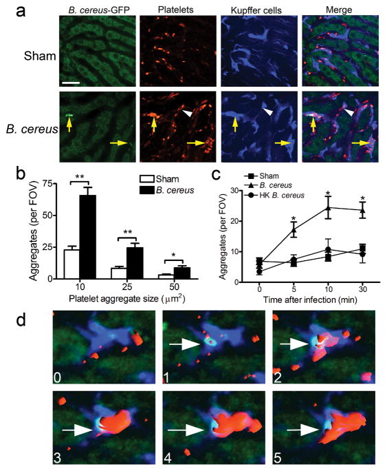 Through the use of intravital imaging of the liver, we demonstrate a collaborative role for platelets with Kupffer cells (KCs) in eradicating blood-borne bacterial infection. Under basal conditions, platelets, via the platelet-adhesion receptor GPIb, formed transient 'touch-and-go' interactions with von Willebrand factor (vWF) constitutively expressed on KCs. Bacteria such as Bacillus cereus and methicillin-resistant Staphylococcus aureus (MRSA) were rapidly caught by KCs and triggered platelets to switch from 'touch-and-go' adhesion to sustained GPIIb-mediated adhesion on the KC surface to encase the bacterium. Infected GPIbα-deficient mice had more endothelial and KC damage than did their wild-type counterparts, which led to more fluid leakage, substantial polycythemia and rapid mortality. Our study identifies a previously unknown surveillance mechanism by which platelets survey macrophages that rapidly converts to a critical host response to blood-borne bacteria.