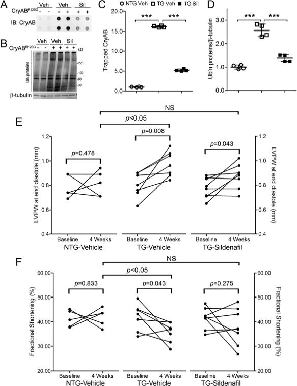 Methods and results: Protein kinase G (PKG) was manipulated genetically and pharmacologically in cultured cardiomyocytes. Activation of PKG increased proteasome peptidase activities, facilitated proteasome-mediated degradation of surrogate (enhanced green fluorescence protein modified by carboxyl fusion of degron CL1) and bona fide (CryAB(R120G)) misfolded proteins, and attenuated CryAB(R120G) overexpression-induced accumulation of ubiquitinated proteins and cellular injury. PKG inhibition elicited the opposite responses. Differences in the abundance of the key 26S proteasome subunits Rpt6 and β5 between the PKG-manipulated and control groups were not statistically significant, but the isoelectric points were shifted by PKG activation. In transgenic mice expressing a surrogate substrate (GFPdgn), PKG activation by sildenafil increased myocardial proteasome activities and significantly decreased myocardial GFPdgn protein levels. Sildenafil treatment significantly increased myocardial PKG activity and significantly reduced myocardial accumulation of CryAB(R120G), ubiquitin conjugates, and aberrant protein aggregates in mice with CryAB(R120G)-based desmin-related cardiomyopathy. No discernible effect on bona fide native substrates of the ubiquitin-proteasome system was observed from PKG manipulation in vitro or in vivo.