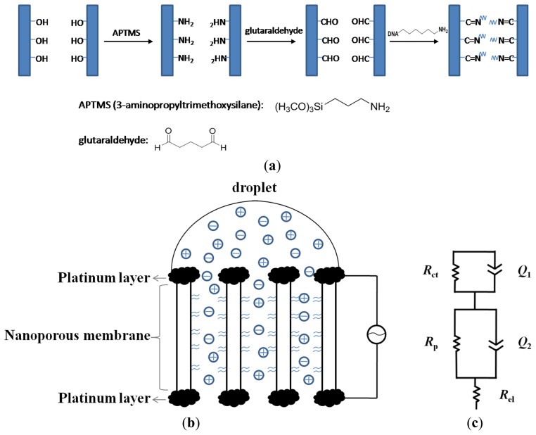 A novel and integrated membrane sensing platform for DNA detection is developed based on an anodic aluminum oxide (AAO) membrane. Platinum electrodes (~50-100 nm thick) are coated directly on both sides of the alumina membrane to eliminate the solution resistance outside the nanopores. The electrochemical impedance technique is employed to monitor the impedance changes within the nanopores upon DNA binding. Pore resistance (Rp) linearly increases in response towards the increasing concentration of the target DNA in the range of 1 × 10⁻¹² to 1 × 10⁻⁶ M. Moreover, the biosensor selectively differentiates the complementary sequence from single base mismatched (MM-1) strands and non-complementary strands. This study reveals a simple, selective and sensitive method to fabricate a label-free DNA biosensor.