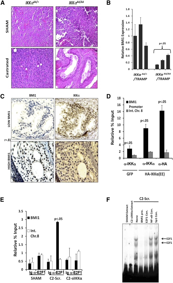 Androgen-deprived prostate cancer (PCa) is infiltrated by B lymphocytes that produce cytokines that activate IκB kinase α (IKKα) to accelerate the emergence of castration-resistant tumors. We now demonstrate that infiltrating B lymphocytes and IKKα are also required for androgen-dependent expansion of epithelial progenitors responsible for prostate regeneration. In these cells and in PCa cells, IKKα phosphorylates transcription factor E2F1 on a site that promotes its nuclear translocation, association with the coactivator CBP, and recruitment to critical genomic targets that include Bmi1, a key regulator of normal and cancerous prostate stem cell renewal. The IKKα-BMI1 pathway is also activated in human PCa.