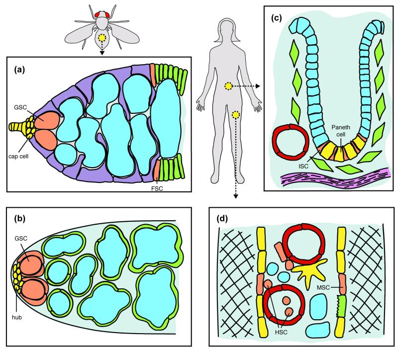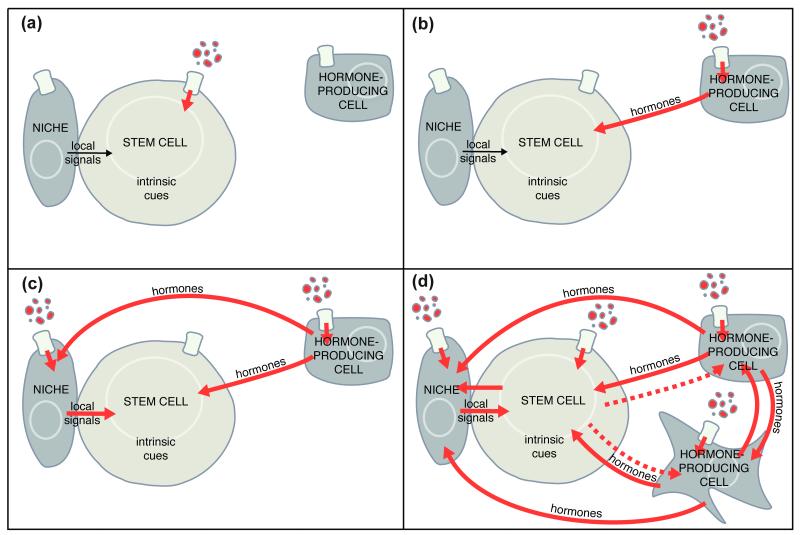 Adult stem cells are inextricably linked to whole-body physiology and nutrient availability through complex systemic signaling networks. A full understanding of how stem cells sense and respond to dietary fluctuations will require identifying key systemic mediators, as well as elucidating how they are regulated and integrated with local and intrinsic factors across multiple tissues. Studies focused on the Drosophila germline have generated valuable insights into how stem cells are controlled by diet-dependent pathways, and increasing evidence suggests that diverse adult stem cell populations respond to nutrients through similar mechanisms. Systemic signals, including nutrients themselves and diet-regulated hormones such as Insulin/Insulin-like growth factor or steroid hormones, can directly or indirectly affect stem cell behavior by modifying local cell-cell communication or intrinsic factors. The physiological regulation of stem cells in response to nutritional status not only is a fascinating biological problem, but also has clinical implications, as research in this field holds the key to noninvasive approaches for manipulating stem cells in vivo. In addition, given the known associations between diet, stem cells, and cancer risk, this research may inspire novel anticancer therapies.