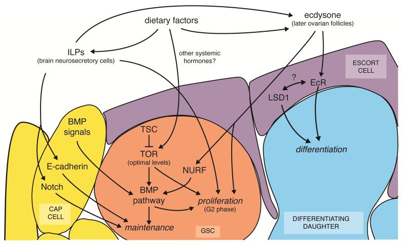 - Drummond-Barbosa D, Spradling AC. Stem cells and their progeny respond to nutritional changes during Drosophila oogenesis. Dev Biol. 2001;231:265–278. - PubMed