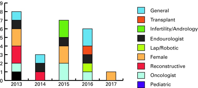 Results: The response rate was 100%. There are 13 urology training programs across Canada located in 6 out of the 10 provinces. Robotic surgery is available at 9 out of the 13 centres. A total of 68 urologists need to be recruited by academic institutions throughout Canada within the next 5 years. The greatest need is for general urologists, with a total of 13 required. This is followed by 12 urologic oncologists needed, 11 female urology, 7 reconstructive urologists, 6 pediatric urologists, 6 endourologists, 5 transplant surgeons, 4 infertility/andrology, and 4 experts in advanced laparoscopy/robotics. There was no need for any urologic trauma surgeons in any academic institution surveyed.