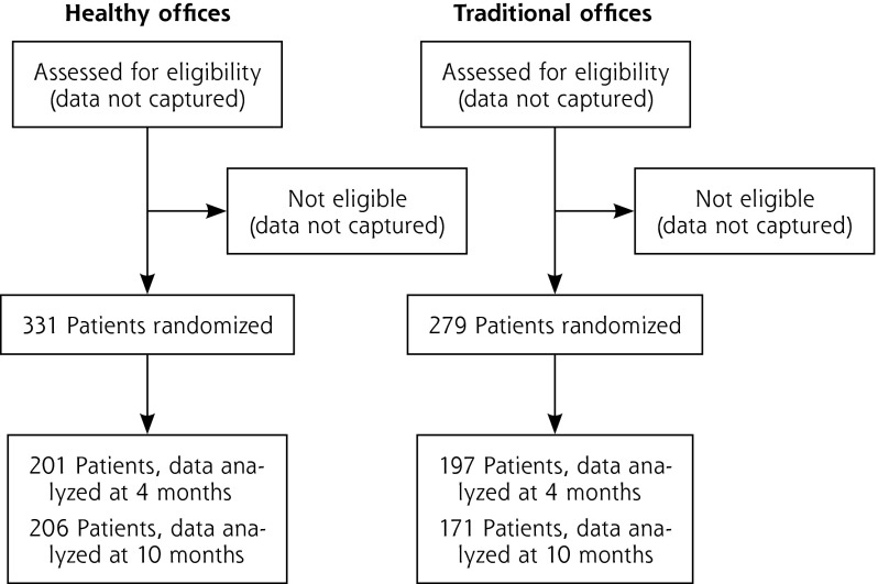Methods: We conducted a randomized trial in which 24 family medicine practices were randomized to (1) an enhanced practice approach in which clinicians and office staff used AIM-HI tools to make personal changes and created a healthy environment, or (2) a traditional practice approach in which physicians and staff were trained and asked to use the tools with patients. Of the 610 patients enrolled, 331 were in healthy practices, and 279 were in traditional practices. At 0, 4, and 10 months we assessed blood pressure, body mass index, fasting blood glucose and insulin levels, nuclear magnetic resonance lipoprotein profiles, fitness, dietary intake, physical activity, and emotional well-being. Outcome data were analyzed using linear, mixed-effects multivariate models, adjusting for practices as a random effect.