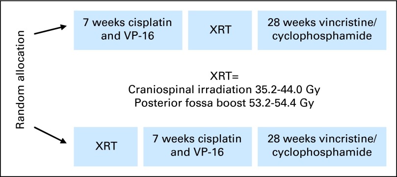 Patients and methods: One hundred twelve patients were randomly assigned to each arm. Criteria used to categorize patients as high risk included M1-4 disease by modified Chang staging classification, T3b/T4 disease, or greater than 1.5 cm3 of residual tumor after surgery. Postoperatively, children with high-risk medulloblastoma were randomly assigned to two arms, either chemotherapy entailing three cycles of cisplatin and etoposide before radiation (chemotherapy first [CT1]) or the same chemotherapy regimen after radiation (radiation therapy first [RT1]). Both groups received consolidation chemotherapy consisting of vincristine and cyclophosphamide.