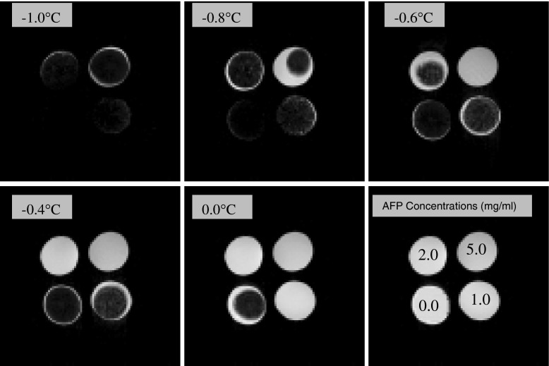 The effects of a type I AFP on the bulk melting of frozen AFP solutions and frozen AFP+solute solutions were studied through an NMR microimaging experiment. The solutes studied include sodium chloride and glucose and the amino acids alanine, threonine, arginine, and aspartic acid. We found that the AFP is able to induce the bulk melting of the frozen AFP solutions at temperatures lower than 0 °C and can also keep the ice melted at higher temperatures in the AFP+solute solutions than those in the corresponding solute solutions. The latter shows that the ice phases were in super-heated states in the frozen AFP+solute solutions. We have tried to understand the first experimental phenomenon via the recent theoretical prediction that type I AFP can induce the local melting of ice upon adsorption to ice surfaces. The latter experimental phenomenon was explained with the hypothesis that the adsorption of AFP to ice surfaces introduces a less hydrophilic water-AFP-ice interfacial region, which repels the ionic/hydrophilic solutes. Thus, this interfacial region formed an intermediate chemical potential layer between the water phase and the ice phase, which prevented the transfer of water from the ice phase to the water phase. We have also attempted to understand the significance of the observed melting phenomena to the survival of organisms that express AFPs over cold winters.