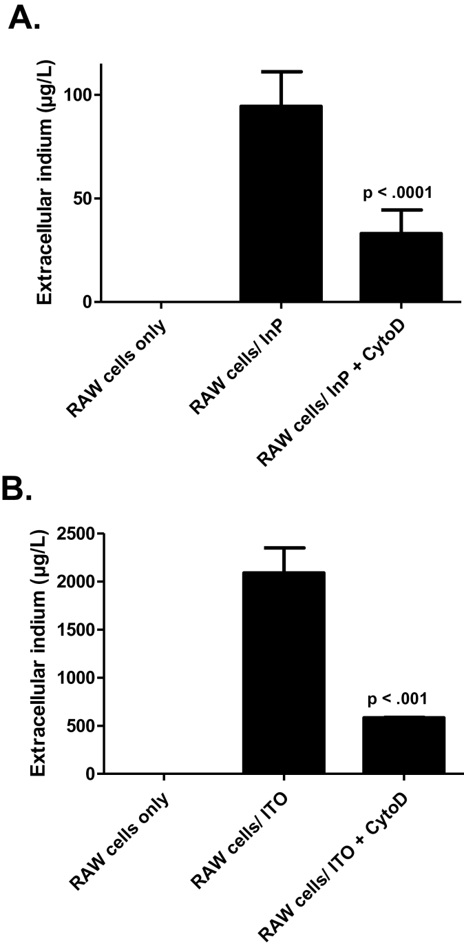 Indium-containing particles (ICPs) are used extensively in the microelectronics industry. Pulmonary toxicity is observed after inhalation exposure to ICPs; however, the mechanism(s) of pathogenesis is unclear. ICPs are insoluble at physiological pH and are initially engulfed by alveolar macrophages (and likely airway epithelial cells). We hypothesized that uptake of ICPs by macrophages followed by phagolysosomal acidification results in the solubilization of ICPs into cytotoxic indium ions. To address this, we characterized the in vitro cytotoxicity of indium phosphide (InP) or indium tin oxide (ITO) particles with macrophages (RAW cells) and lung-derived epithelial (LA-4) cells at 24h using metabolic (3-(4,5-dimethylthiazolyl-2)-2,5-diphenyltetrazolium bromide) and membrane integrity (lactate dehydrogenase) assays. InP and ITO were readily phagocytosed by RAW and LA-4 cells; however, the particles were much more cytotoxic to RAW cells and cytotoxicity was dose dependent. Treatment of RAW cells with cytochalasin D (CytoD) blocked particle phagocytosis and reduced cytotoxicity. Treatment of RAW cells with bafilomycin A1, a specific inhibitor of phagolysosomal acidification, also reduced cytotoxicity but did not block particle uptake. Based on direct indium measurements, the concentration of ionic indium was increased in culture medium from RAW but not LA-4 cells following 24-h treatment with particles. Ionic indium derived from RAW cells was significantly reduced by treatment with CytoD. These data implicate macrophage uptake and solubilization of InP and ITO via phagolysosomal acidification as requisite for particle-induced cytotoxicity and the release of indium ions. This may apply to other ICPs and strongly supports the notion that ICPs require solubilization in order to be toxic.