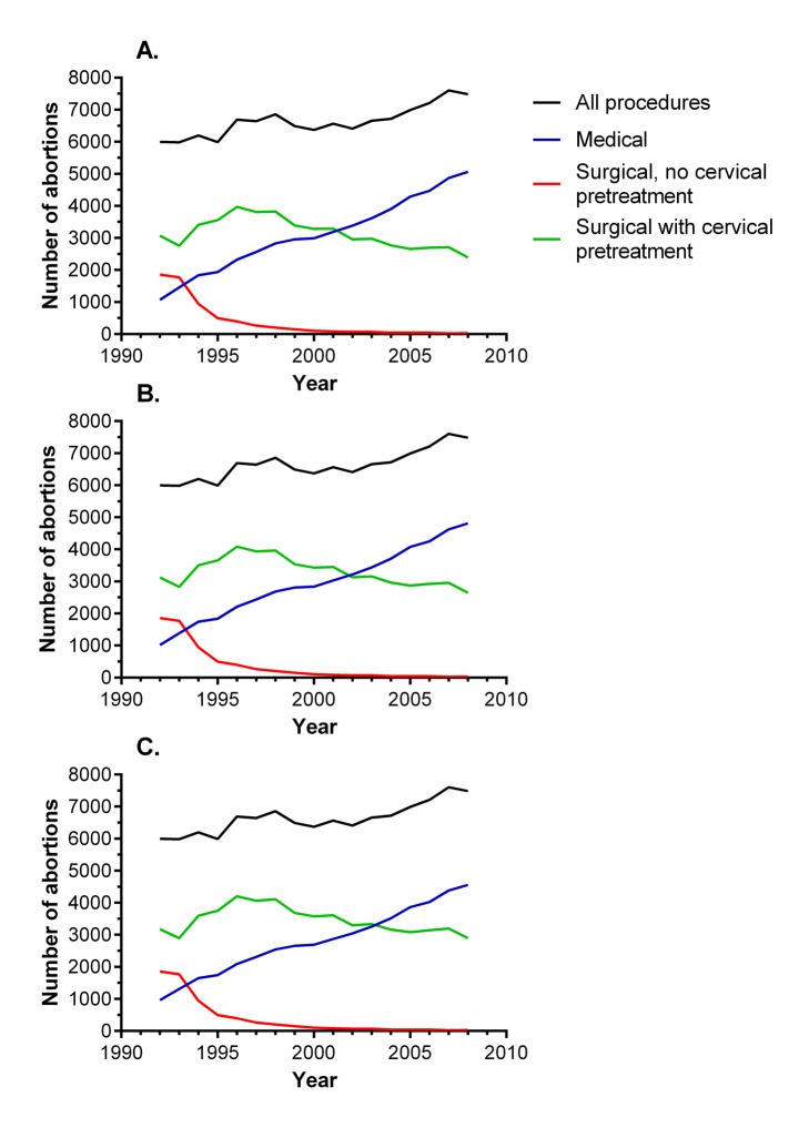 Methods and findings: We studied linked Scottish national databases of births and perinatal deaths. We analysed the risk of preterm birth in relation to the number of previous abortions in 732,719 first births (≥24 wk), adjusting for maternal characteristics. The risk (adjusted odds ratio [95% CI]) of preterm birth was modelled using logistic regression, and associations were expressed for a one-unit increase in the number of previous abortions. Previous abortion was associated with an increased risk of preterm birth (1.12 [1.09-1.16]). When analysed by year of delivery, the association was strongest in 1980-1983 (1.32 [1.21-1.43]), progressively declined between 1984 and 1999, and was no longer apparent in 2000-2003 (0.98 [0.91-1.05]) or 2004-2008 (1.02 [0.95-1.09]). A statistical test for interaction between previous abortion and year was highly statistically significant (p<0.001). Analysis of data for abortions among nulliparous women in Scotland 1992-2008 demonstrated that the proportion that were surgical without use of cervical pre-treatment decreased from 31% to 0.4%, and that the proportion of medical abortions increased from 18% to 68%.