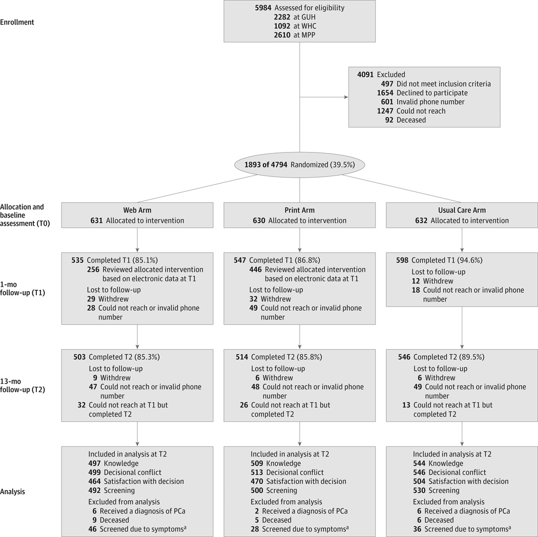 Intervention: Random assignment to print-based decision aid (n = 628), web-based interactive decision aid (n = 625), or usual care (UC) (n = 626).