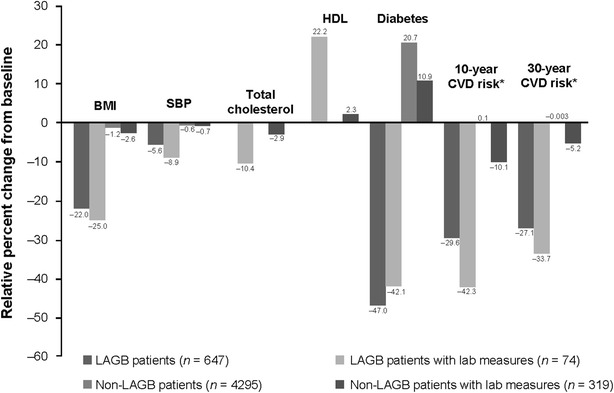 Results: Mean BMI in LAGB patients (n = 647, average age 45.66 years, 81.1% female) decreased from 42.7 to 33.4 kg/m² (P < 0.0001), with 35.4% no longer obese; 10- and 30-year estimated CVD risk decreased from 10.8 to 7.6% (P < 0.0001) and 44.34 to 32.30% (P < 0.0001), respectively, 12-15 months post-LAGB. Improvements were significantly greater than in non-LAGB patients (N = 4,295) (P < 0.0001). In the subset with lipid data (n = 74), improvements in total (-20.6 mg/dL; P < 0.05) and high-density lipoprotein (+10.6 mg/dL, P < 0.0001) cholesterol 1 year post-LAGB were also observed.