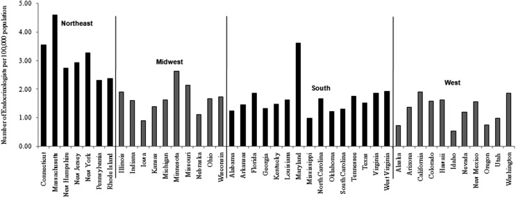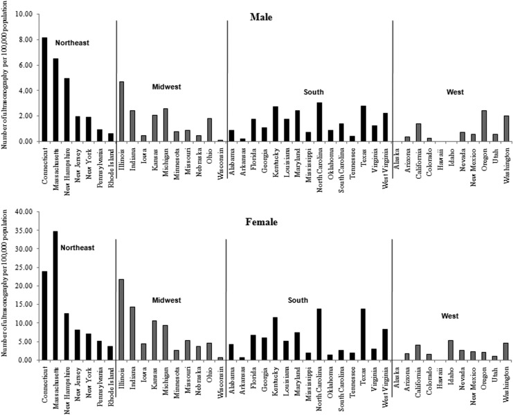 Results: Age-standardized incidence rates of thyroid cancer have increased in every state in the United States. Significant regional variations were noted, with the highest incidence rates in the northeast and the lowest in the south. The incidence rates were significantly correlated with the density of endocrinologists (r = 0.58, p<0.0001 for males; r = 0.44, p = 0.0031 for females) and the employment of cervical ultrasonography (r = 0.40, p = 0.0091 for males; r = 0.36, p = 0.0197 for females). Both the density of endocrinologists and general surgeons and employment of cervical ultrasonography could explain 57% of the variability in state-level incidence for males and 49% for females.