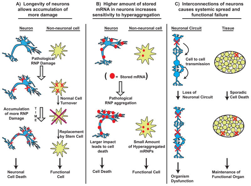 The molecular processes that contribute to degenerative diseases are not well understood. Recent observations suggest that some degenerative diseases are promoted by the accumulation of nuclear or cytoplasmic RNA-protein (RNP) aggregates, which can be related to endogenous RNP granules. RNP aggregates arise commonly in degenerative diseases because RNA-binding proteins commonly self-assemble, in part through prion-like domains, which can form self-propagating amyloids. RNP aggregates may be toxic due to multiple perturbations of posttranscriptional control, thereby disrupting the normal "ribostasis" of the cell. This suggests that understanding and modulating RNP assembly or clearance may be effective approaches to developing therapies for these diseases.
