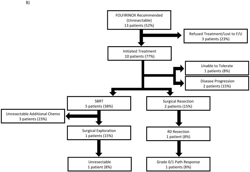 Results: FOLFIRINOX was recommended for 25 patients with pancreatic cancer, 13 (52%) unresectable and 12 (48%) borderline resectable. Four patients (16%) refused treatment or were lost to follow-up. Twenty-one patients (84%) were treated with a median of 4.7 cycles. Six patients (29%) required dose reductions secondary to toxicity. Two patients (9%) were unable to tolerate treatment and three patients (14%) had disease progression on treatment. Seven patients (33%) underwent surgical resection following treatment with FOLFIRINOX alone, 2 (10%) of which were initially unresectable. Two patients underwent resection following FOLFIRINOX + stereotactic body radiation therapy (SBRT). The R0 resection rate for patients treated with FOLFIRINOX ± SBRT was 33% (55% borderline resectable, 10% unresectable). A total of five patients (24%) demonstrated a significant pathologic response.