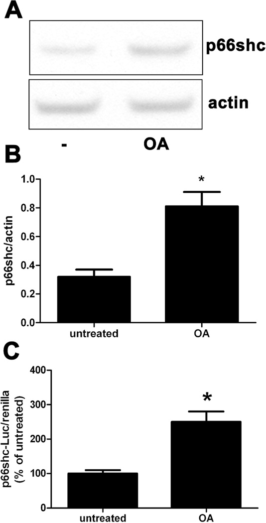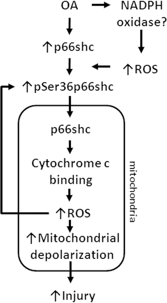 Methods: Renal proximal tubule cells were used and treated with OA: ROS production, mitochondrial depolarization as well as injury were determined. Transcriptional effects of OA on the p66shc gene were determined in a reporter luciferase assay. The role of p66shc in adverse effects of OA was determined using knockdown, p66shc serine36 phosphorylation and cytochrome c binding-deficient cells.