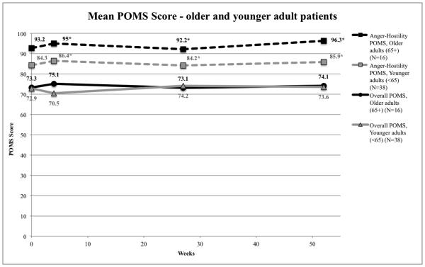 Results: Of 131 patients in the larger randomized controlled study, we report data on 54 evaluable patients (16 older adults and 38 younger adults) randomized to the intervention. Older adult patients reported better overall QOL (LASA 74.4 vs. 62.9, p = 0.040), higher social well-being (FACT-G 91.1 vs. 83.3, p = 0.045), and fewer problems with anger (POMS anger-hostility 95.0 vs. 86.4, p = 0.028). Long-term benefits for older patients were seen in the anger-hostility scale at week 27 (92.2 vs. 84.2, p = 0.027) and week 52 (96.3 vs. 85.9, p = 0.005).