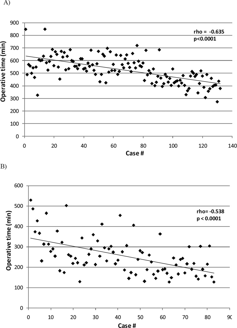 Results: A total of 250 consecutive robotic pancreatic resections were analyzed; pancreaticoduodenectomy (132), distal pancreatectomy (83), central pancreatectomy (13), pancreatic enucleation (10), total pancreatectomy (5), Appleby resection (4), and Frey procedure (3). Thirty-day and 90-day mortality was 0.8% and 2.0%. Rate of Clavien 3 and 4 complications was 14% and 6%. The International Study Group on Pancreatic Fistula grade C fistula rate was 4%. Mean operative time for the 2 most common procedures was 529 ± 103 minutes for pancreaticoduodenectomy and 257 ± 93 minutes for distal pancreatectomy. Continuous improvement in operative times was observed over the course of the experience. Conversion to open procedure was required in 16 patients (6%) (11 with pancreaticoduodenectomy, 2 with distal pancreatectomy, 2 with central pancreatectomy, 1 with total pancreatectomy) for failure to progress (14) and bleeding (2).