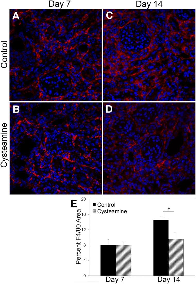 Therapy to slow the relentless expansion of interstitial extracellular matrix that leads to renal functional decline in patients with CKD is currently lacking. Because chronic kidney injury increases tissue oxidative stress, we evaluated the antifibrotic efficacy of cysteamine bitartrate, an antioxidant therapy for patients with nephropathic cystinosis, in a mouse model of unilateral ureteral obstruction. Fresh cysteamine (600 mg/kg) was added to drinking water daily beginning on the day of surgery, and outcomes were assessed on days 7, 14, and 21 after surgery. Plasma cysteamine levels showed diurnal variation, with peak levels similar to those observed in patients with cystinosis. In cysteamine-treated mice, fibrosis severity decreased significantly at 14 and 21 days after unilateral ureteral obstruction, and renal oxidized protein levels decreased at each time point, suggesting reduced oxidative stress. Consistent with these results, treatment of cultured macrophages with cysteamine reduced cellular generation of reactive oxygen species. Furthermore, treatment with cysteamine reduced α-smooth muscle actin-positive interstitial myofibroblast proliferation and mRNA levels of extracellular matrix proteins in mice and attenuated myofibroblast differentiation and proliferation in vitro, but did not augment TGF-β signaling. In a study of renal ischemia reperfusion, cysteamine therapy initiated 10 days after injury and continued for 14 days decreased renal fibrosis by 40%. Taken together, these data suggest previously unrecognized antifibrotic actions of cysteamine via TGF-β-independent mechanisms that include oxidative stress reduction and attenuation of the myofibroblast response to kidney injury and support further investigation into the potential benefit of cysteamine therapy in the treatment of CKD.
